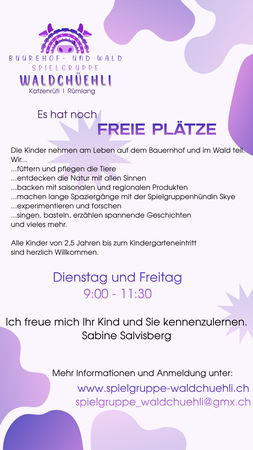In der Buurehof- und Waldspielgruppe Waldchüehli nehmen die Kinder am Leben auf dem Bauernhof teil. Wir füttern die Tiere (Kühe, Katzen, Hühner, Schildkröten, Ponys & Hunde) und pflegen sie. Wir backen mit saisonalen und regionalen Produkten. Gemeinsam mit der Spielgruppenhündin Skye machen wir lange Spaziergänge zu den Enten am Büsisee/ Katzensee und in den Wald.